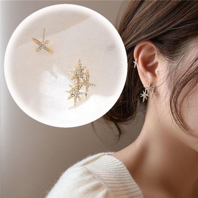 商品名:ピアス 星 キラキラ ビジューピアス アシンメトリー 大ぶり左右非対称 かわいい お洒落 輝く小顔効果(メール便送料無料)