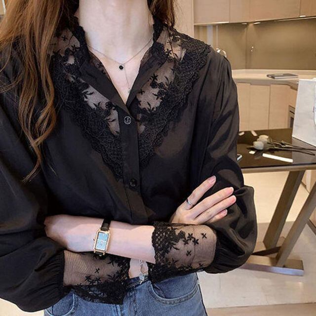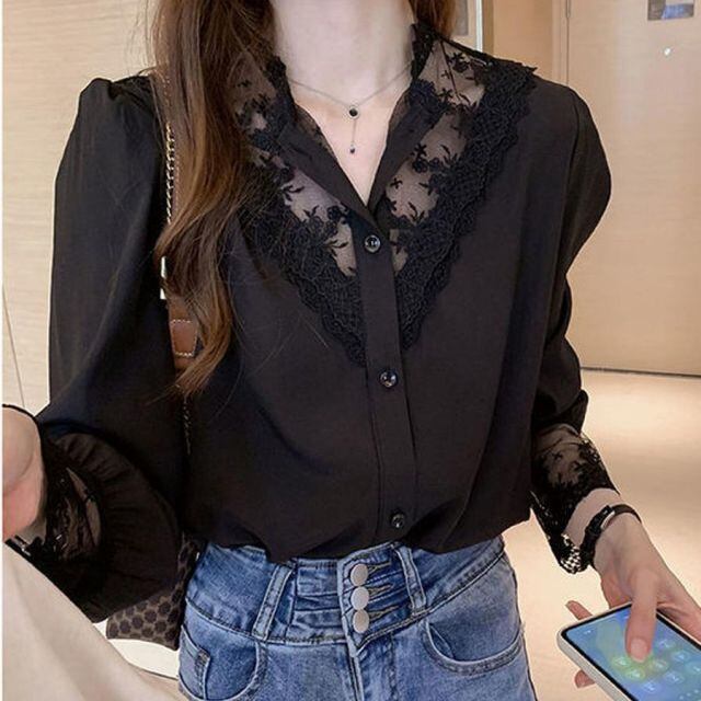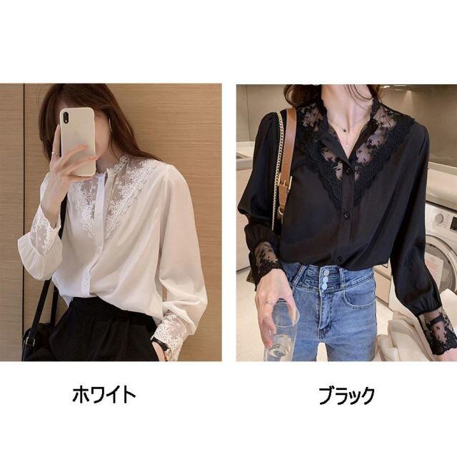 商品名:2022新作ブラウス シャツ トップス シャツ 白 Vネック シャツブラウス レース切替え 長袖 おしゃれ オフィス 韓国風(メール便送料無料)
