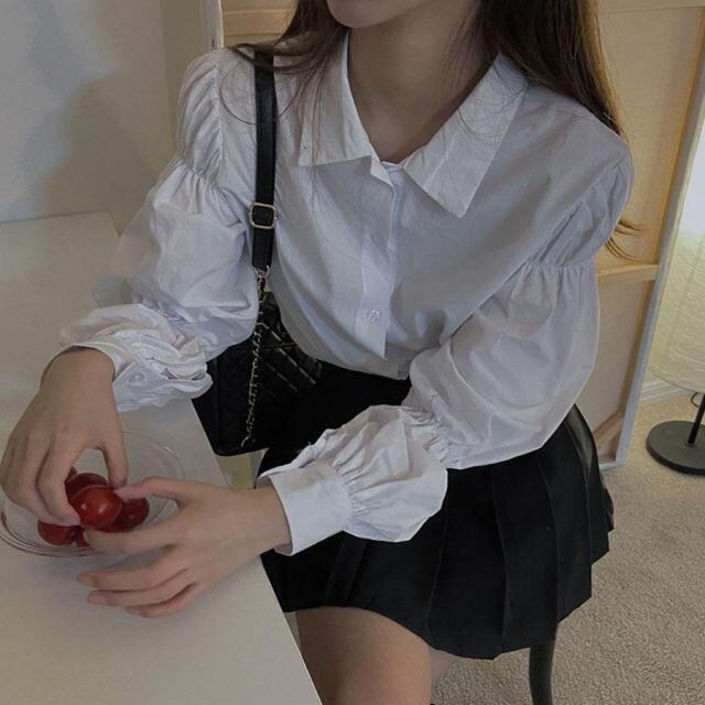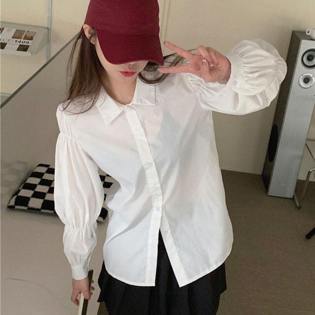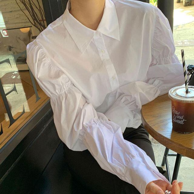 商品名:2022新作ボリュームスリーブシャツ シャツ ブラウス トップス おしゃれ 長袖 ホワイト ファッション 可愛い かわいい 無地 大人(メール便送料無料)