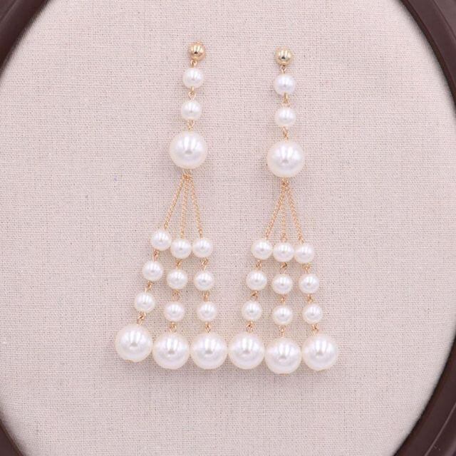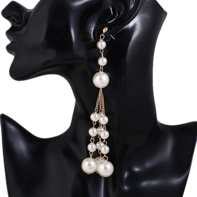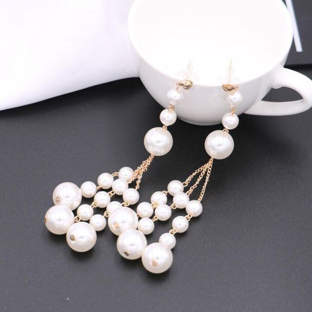 輝く揺れ感の3連大粒フェイクパールロングピアス