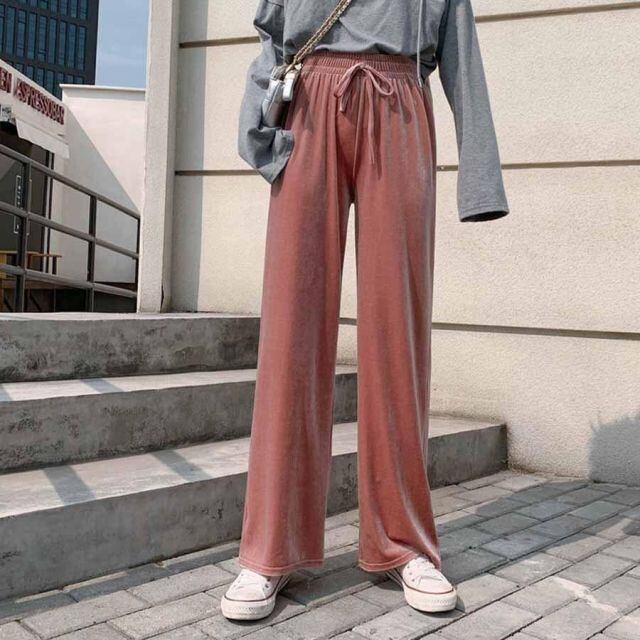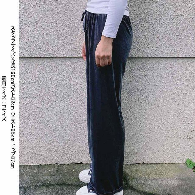 商品名:ワイドドパンツ ベロア ロング丈 ウエストゴム バギーパンツ カジュアルパンツ 光沢感 無地 ゆるい 体型カバー 脚長(メール便送料無料)