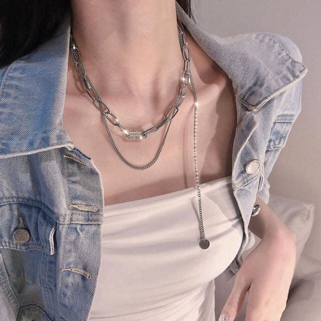 2つのチェーンが首元のお洒落度を高める、チョーカーネックレス。