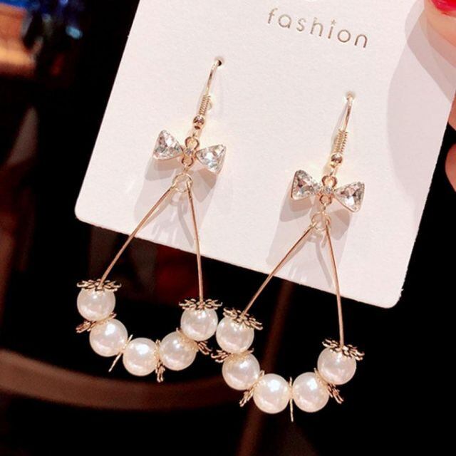 ピアス レディース パール 大きめ 揺れる ぶらさがり リボン ゴールド(メール便送料無料)