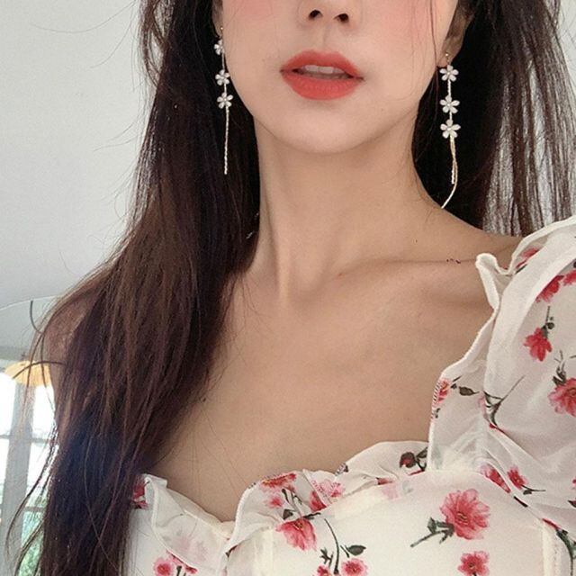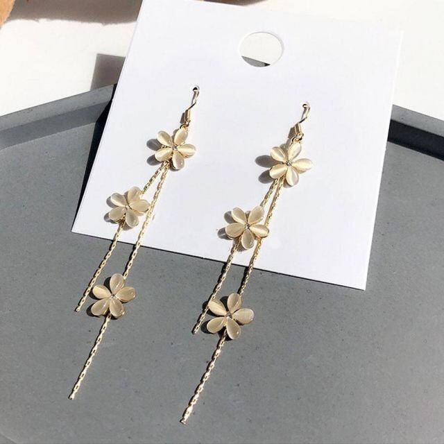 大人フェミニンな大ぶり花を3連ねた揺れるロングピアス。