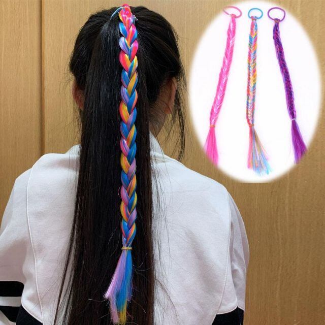 商品名:ヘアアクセサリー エクステ ロング編み込みウィッグ 子供 キッズ ジュニア ダンス ウィッグ つけ毛 カラフル 毛束 ダンサー髪型(メール便送料無料)
