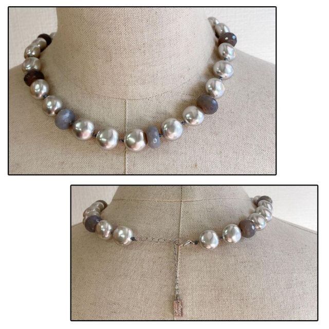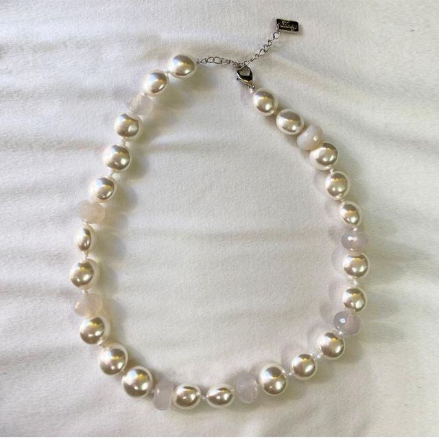 人気のフェイクパールと天然石を連ねた可愛いデザインのネックレス