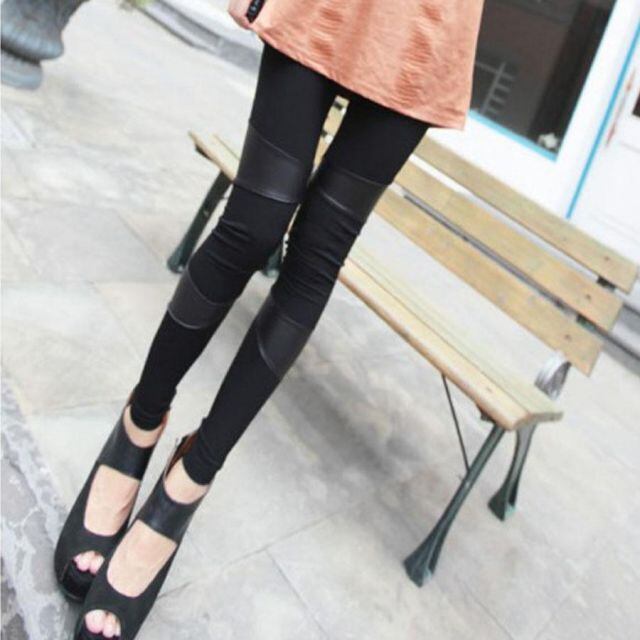 商品名:レギンス スキニーパンツ 9分丈 レギンスパンツ レザー切り替え レギパン ストレッチ タイト 細身美脚効果 ウエストゴム 伸縮性(メール便送料無料)