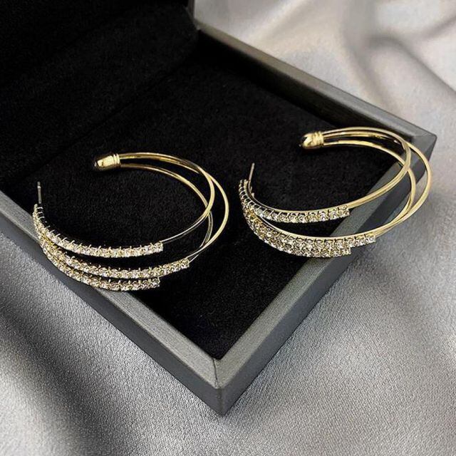商品名:ピアス キラキラ ビジューピアス ロングピアス リング ゴールド シルバー 大ぶり フープピアス 3連 きれいめ(メール便送料無料)