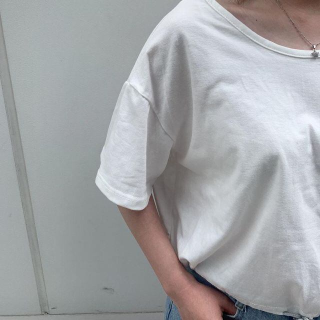 お顔周りをスッキリ見せるショート丈ラウンドネックカットソー。