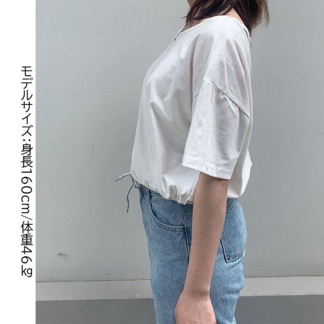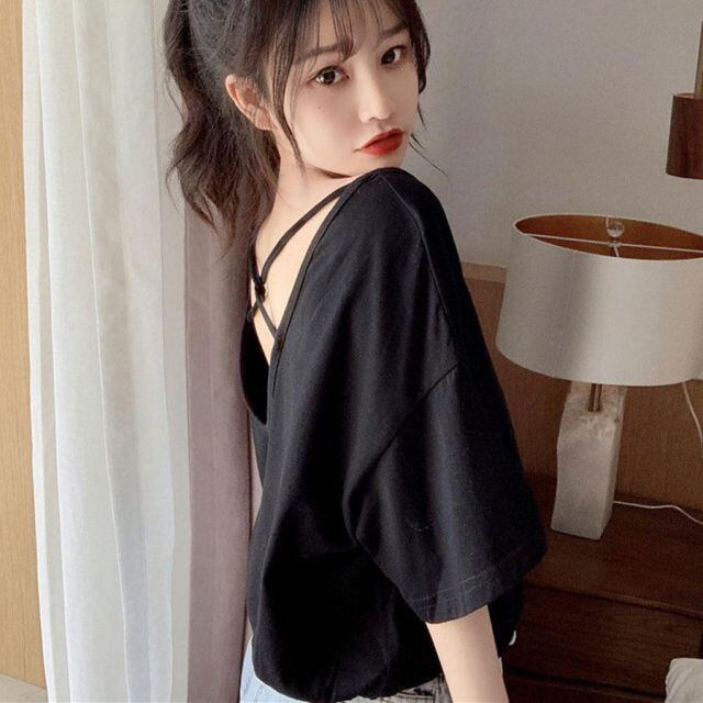 商品名:韓国ファッション 新作 Tシャツ バッククロス 裾紐入り カットソー トップス 半袖 ラウンドネック シンプル ゆったり(メール便送料無料)