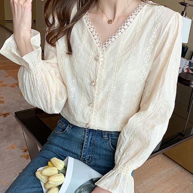 刺繍ブラウス 長袖 Vネック ノーカラー フリル 長袖 透け感 カジュアル 可愛い 着痩せ ボリューム袖 おしゃれ 通勤OL 韓国 ファッション(メール便送料無料)