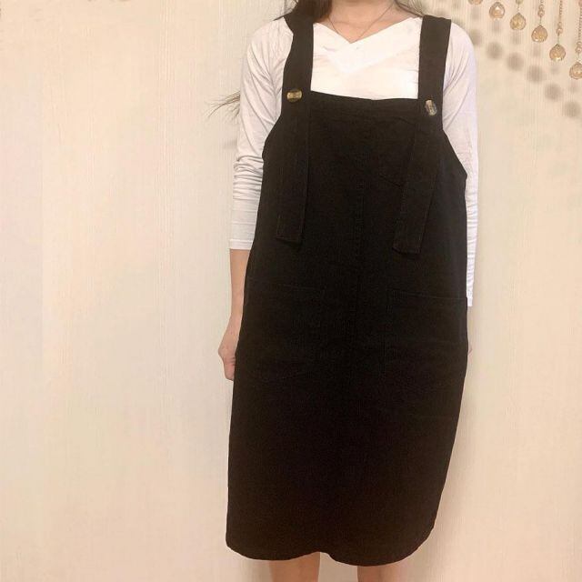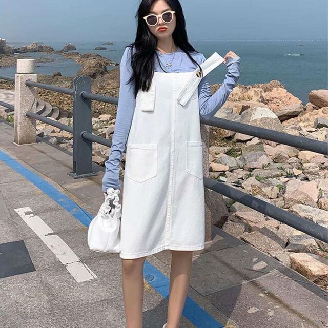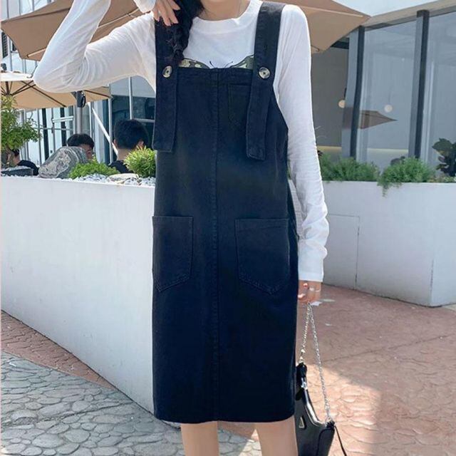 商品名:デニムサロペットスカート 膝丈 オーバーオール ジャンパースカート ゆったり 体型カバー レディース ワンピース オールインワン 韓国風(メール便送料無料)