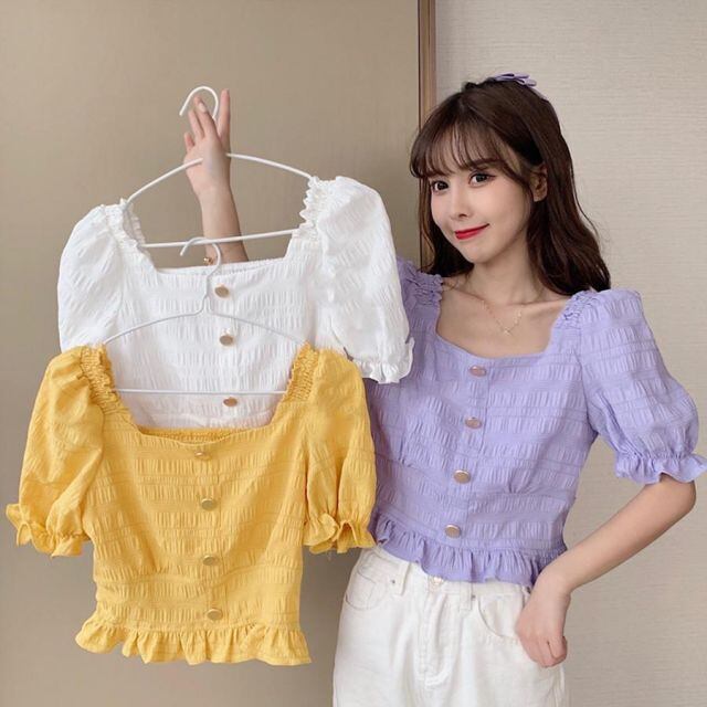 商品名:フリルブラウス 半袖 スクエアネック ショート丈 トップス オルチャンファッション へそ出し 学生 韓国ファッション(メール便送料無料)