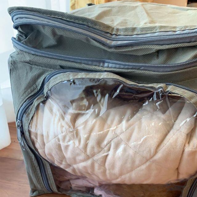 天面、側面の2ヶ所のファスナーで、上からも前からも出し入れできる、仕切り付きの衣類収納袋。