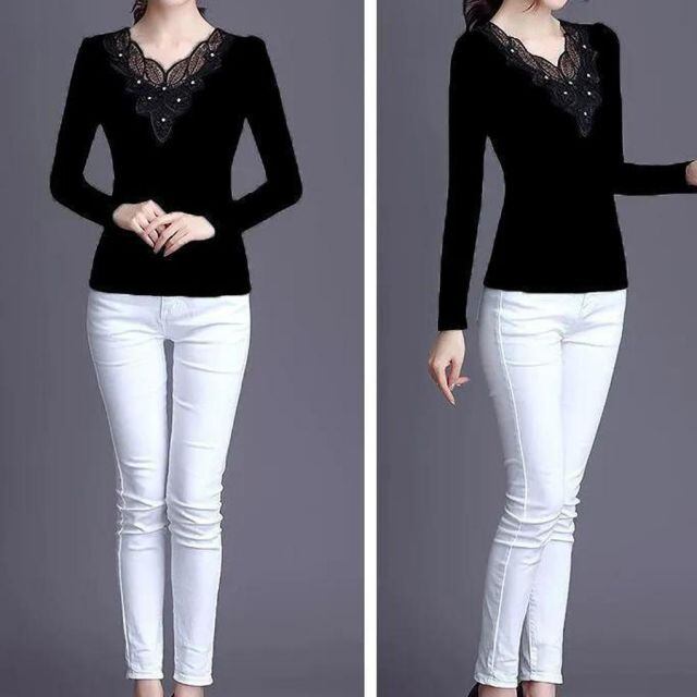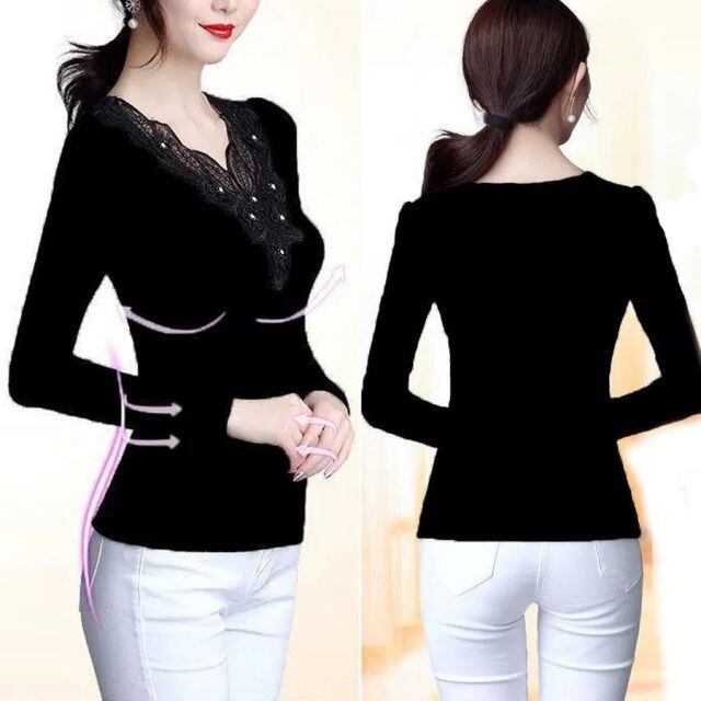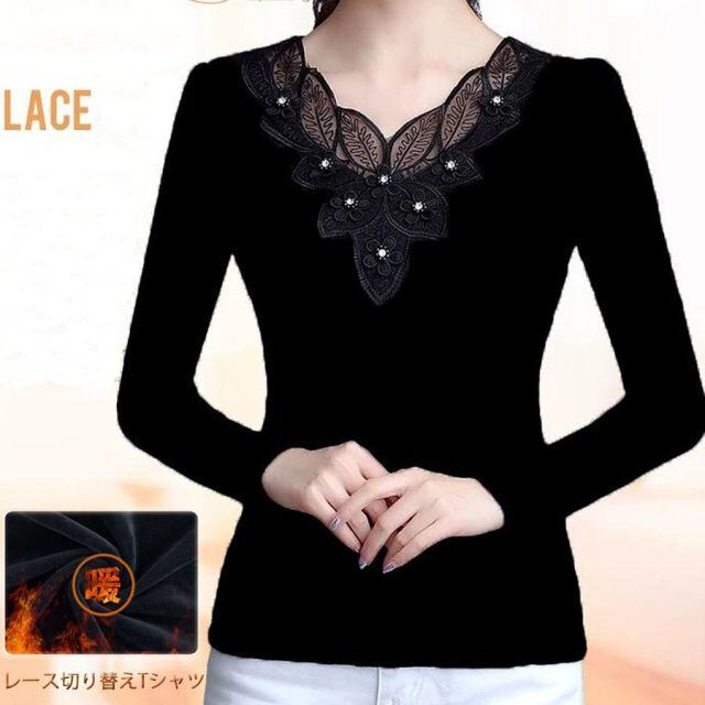 商品名:カットソー レディース 長袖 レース切り替えTシャツ トップス 裏起毛 あったか きれいめ シースルー タイト ストレッチ 伸縮性 無地(メール便送料無料)