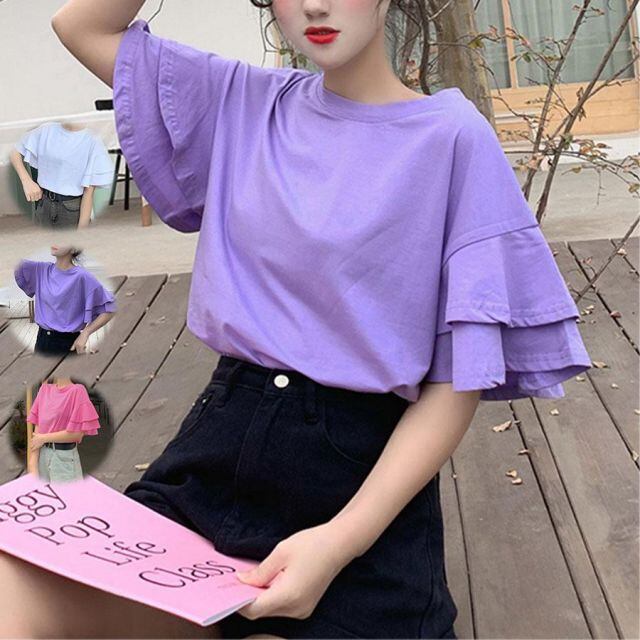 Tシャツレディース カットソー 大きいサイズ フレア袖? フリル 無地 ナチュラル 盛り袖(メール便送料無料)