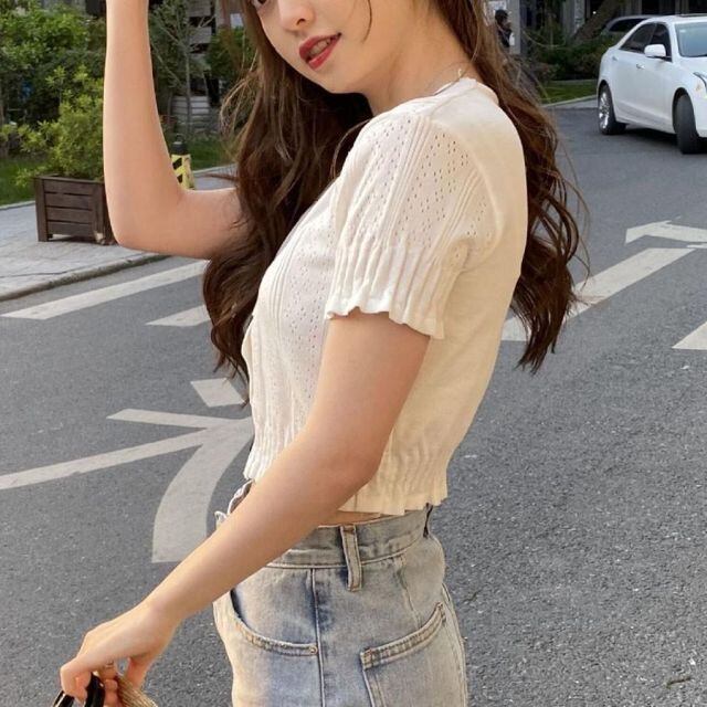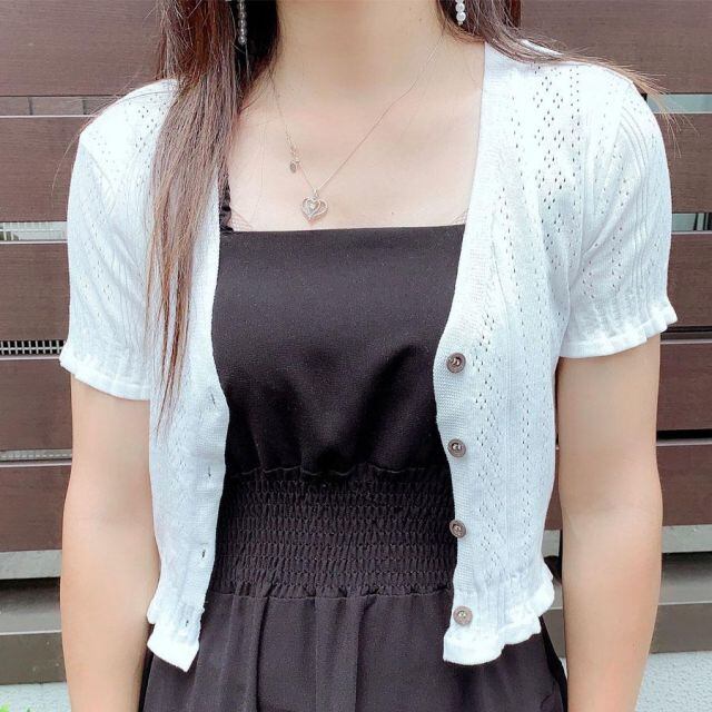 商品名:サマーニット カーディガン レディース 半袖トップス ニット薄手 ショート丈 接触冷感 ニットソー きれいめ 白 無地 おしゃれ Vネック(メール便送料無料)