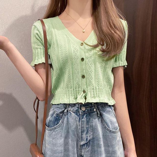 サマーニット カーディガン レディース 半袖トップス ニット薄手 ショート丈 接触冷感 ニットソー きれいめ 白 無地 おしゃれ Vネック(メール便送料無料)