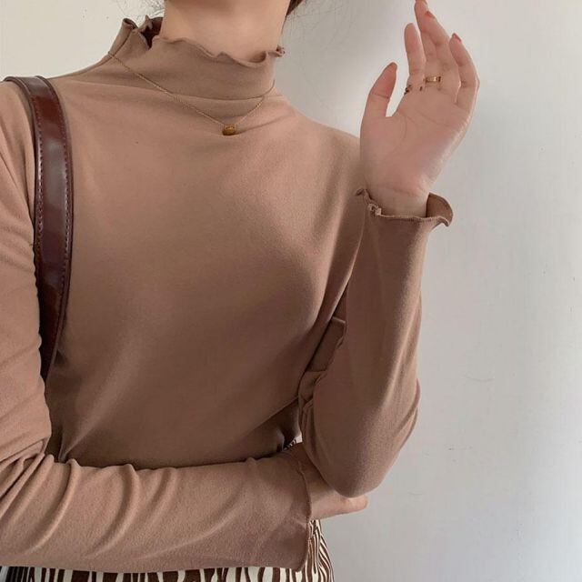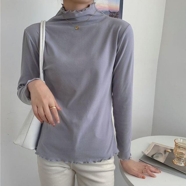 肌あたり柔らかな無地のハイネック長袖Tシャツ。