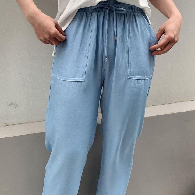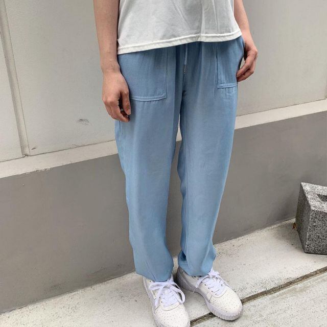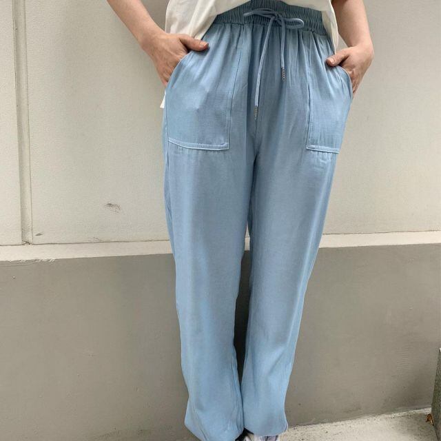 ウエストゴム、ポケットつき、ゆったりしたシルエットでカジュアルな雰囲気を盛り上げる。