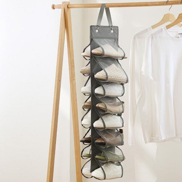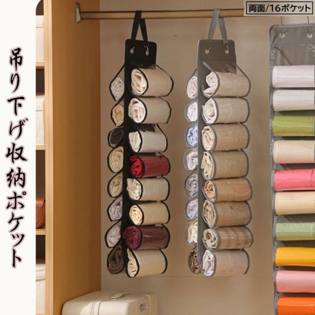 場所をとらない両面タイプの吊り下げ収納ポケット。