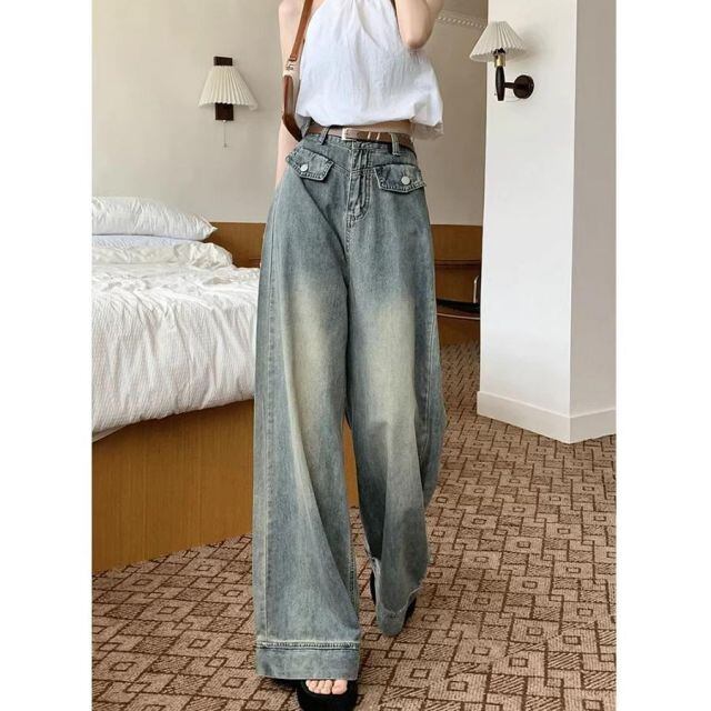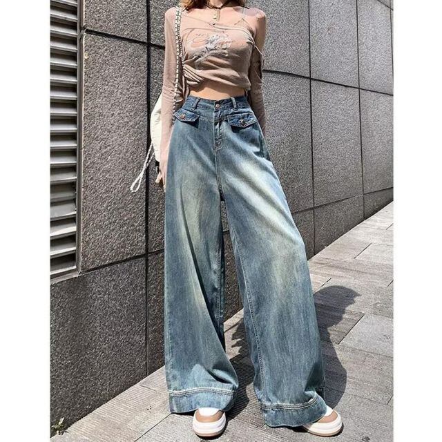 商品名:ワイドデニムパンツ ハイウエスト シンプルデニム ジーパン レディース美脚脚長ボトムス 韓国風ジーンズ レトロデニム デイリー ポケット(メール便送料無料)
