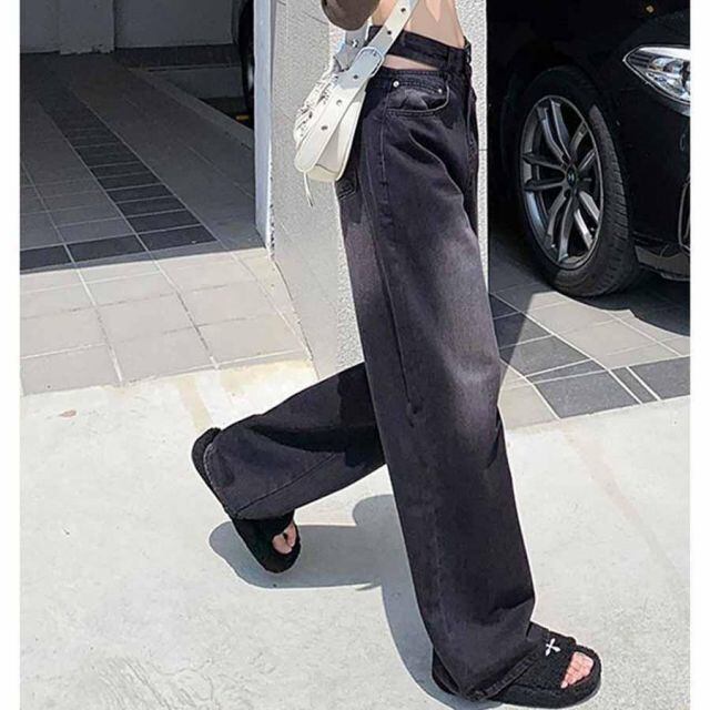 商品名:デニムパンツ ウエスト穴あき ウエストマーク ハイウエスト シンプルデニム レディース 体形カバー 美脚脚長ボトムス 韓国風ジーンズ(メール便送料無料)
