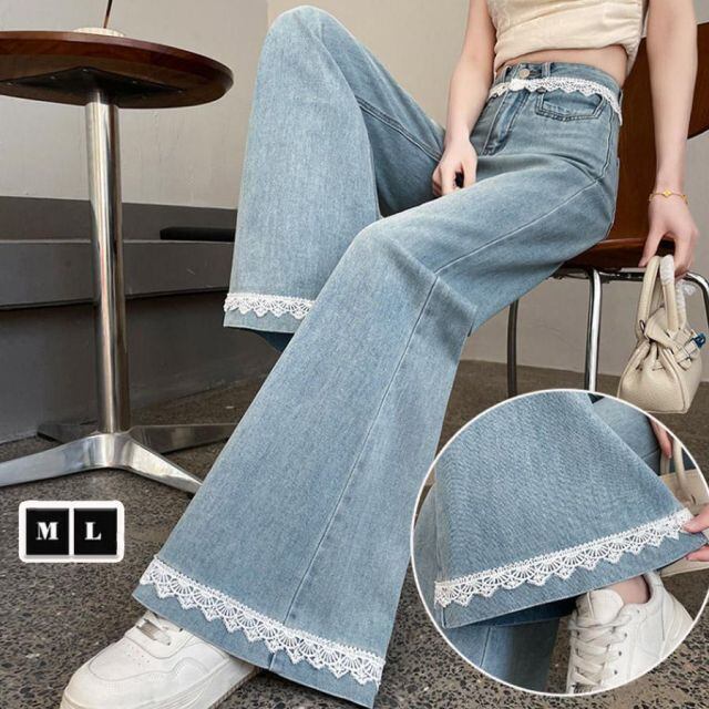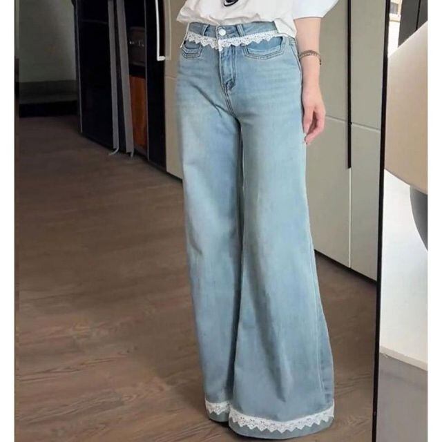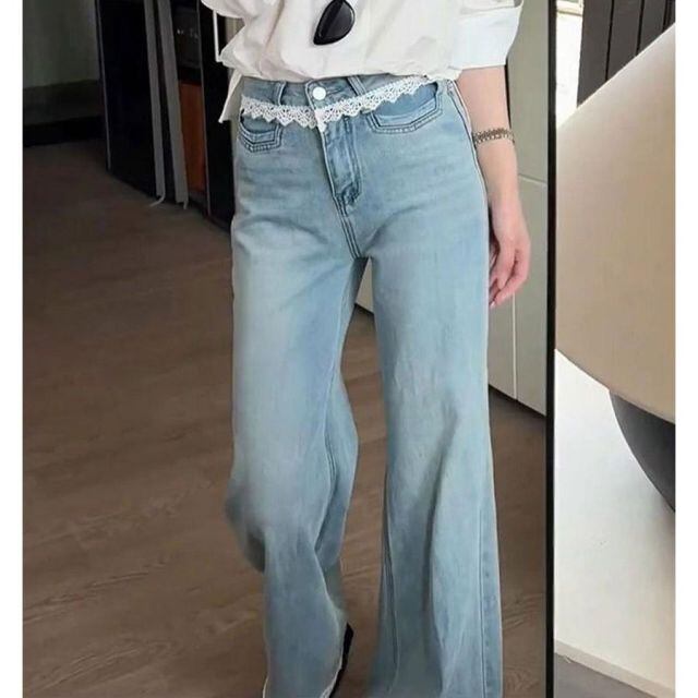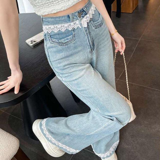 商品名:デニムパンツ レース付き レディース ハイウエストパンツ ジーンズ ジーパン ストレートパンツ ストレートデニム ワイドパンツ(メール便送料無料)