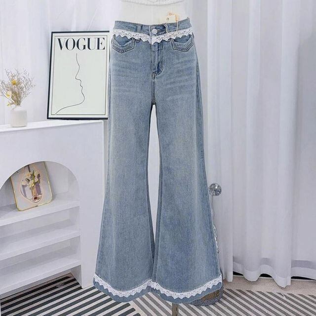 デニムパンツ レース付き レディース ハイウエストパンツ ジーンズ ジーパン ストレートパンツ ストレートデニム ワイドパンツ(メール便送料無料)