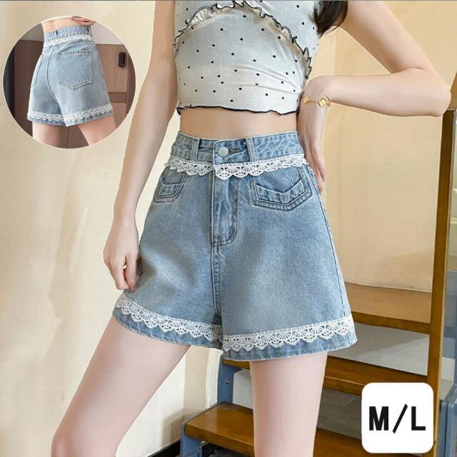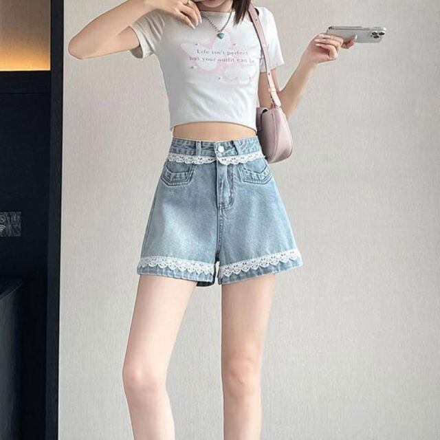 商品名:デニムパンツ レース付き ショートパンツレディース ショーパン スタッズ入り 美脚ボトムス お洒落 カジュアル 着痩せ(メール便送料無料)