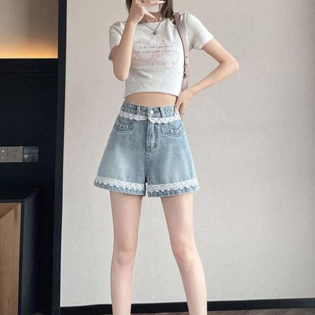 シンプルで着回し力抜群なレース入りデニムショートパンツ。