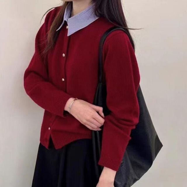 シャツレイヤード 長袖ニットセーター 襟付き レディース ボダン付き グルーネック 秋冬 無地 キレイめ シンプル 秋冬 新作 リブニットトップス(宅急便のみ対応)