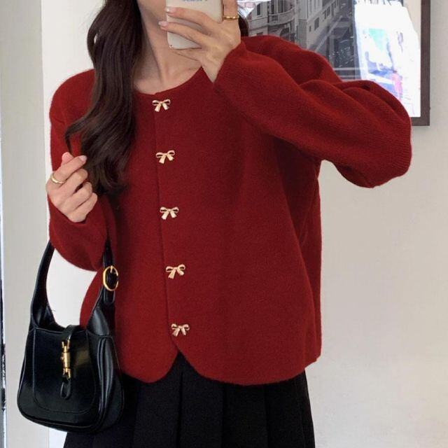使い勝手の良いリボンボタンデザインニットカーディガン。