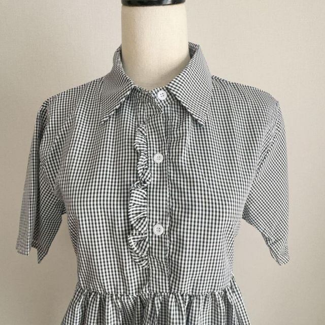 商品名:アシンメトリーフリルシャツ 半袖 チェックシャツ ベーシックカラーシャツ チェッ柄シャツ ブラウストップス レディース(メール便送料無料)