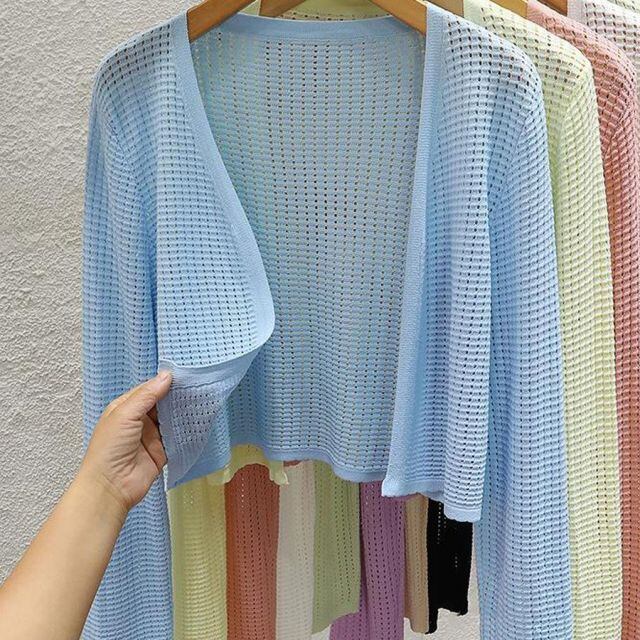 商品名:サマーカーディガン 透かし編み Vネックカーディガン トップス 長袖 ショート丈 透け感 重ね着 フェミニン 大人 シンプル(メール便送料無料)