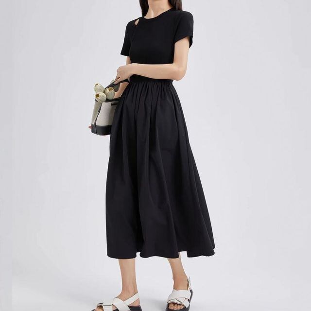 高めのウエスト切り替えデザインが脚長シルエットに導いてくれる。