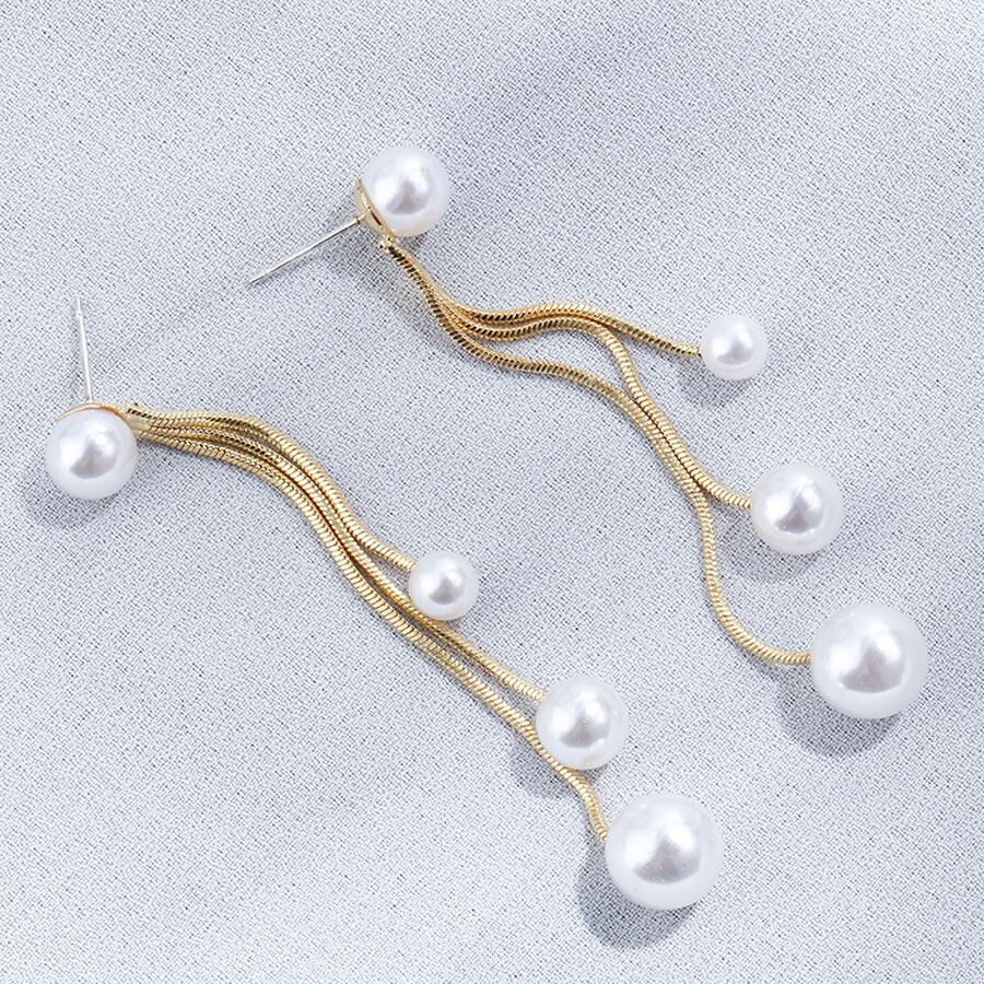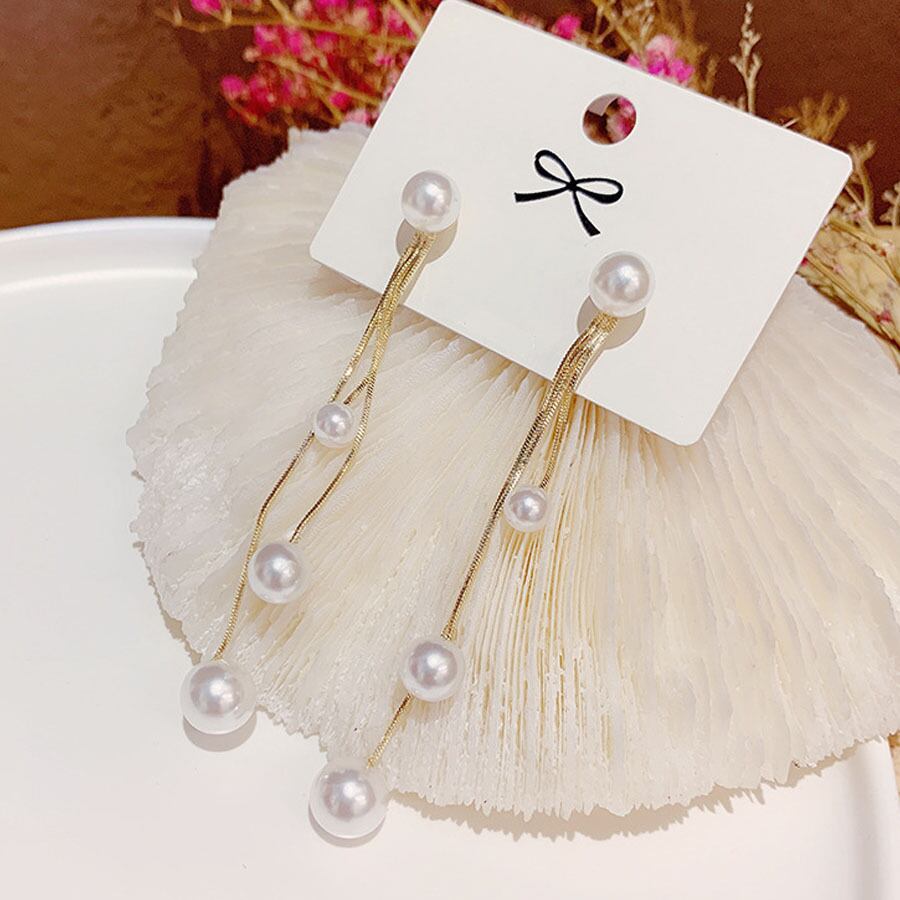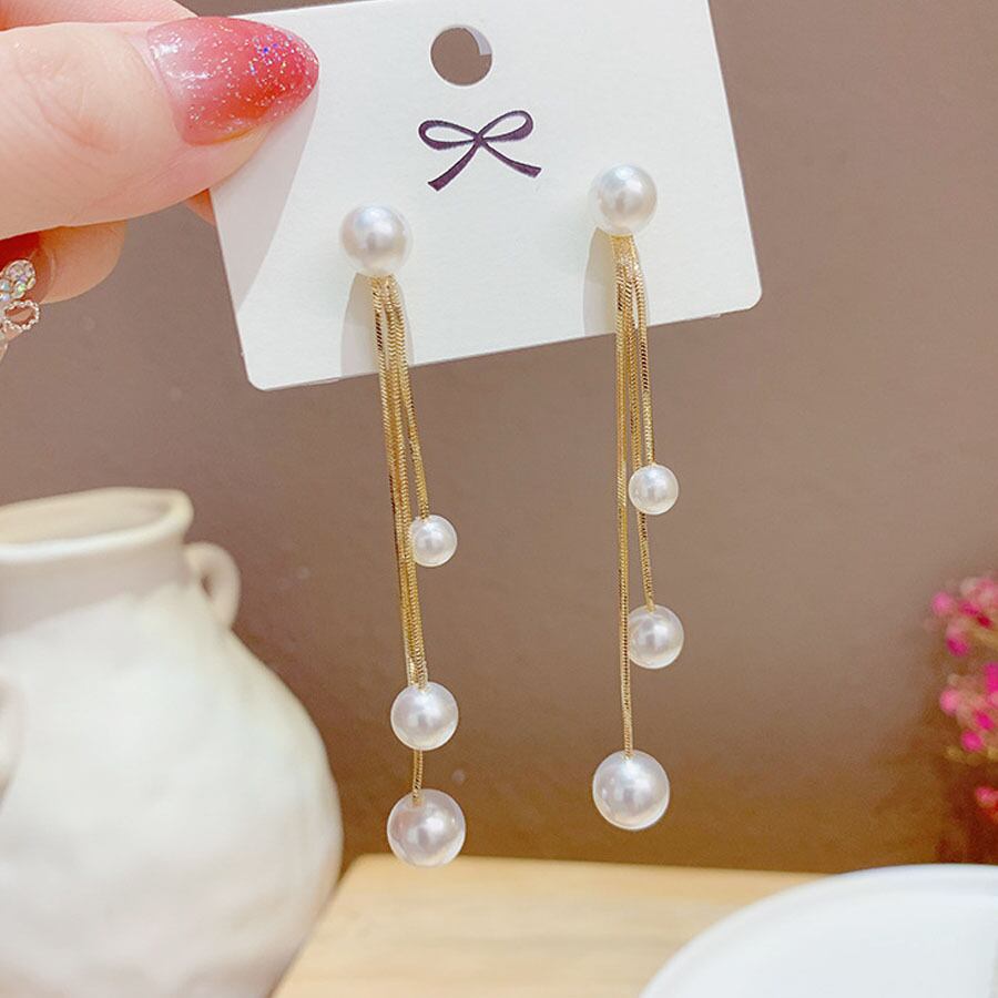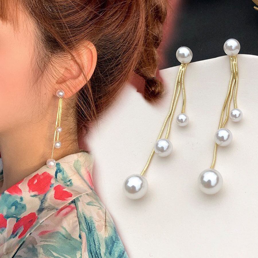 大小サイズの異なるパールを3連ねた揺れるロングピアス。
