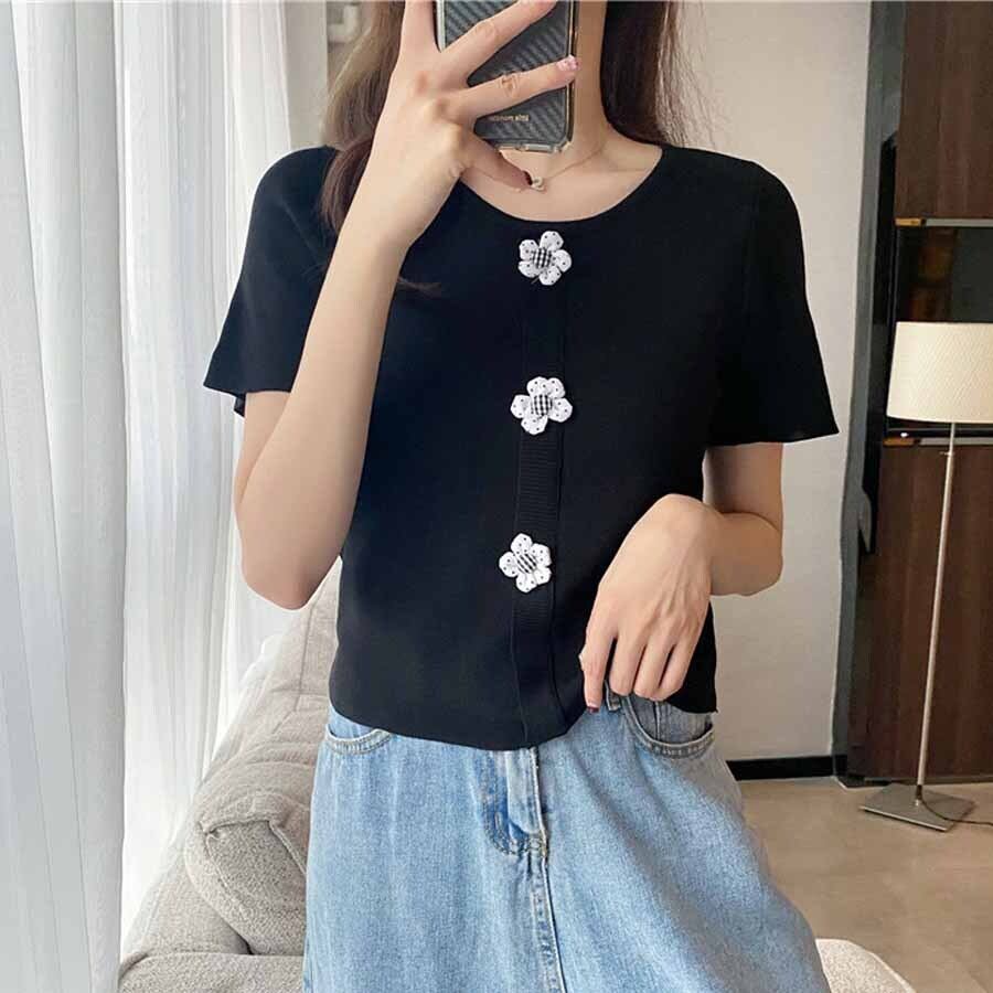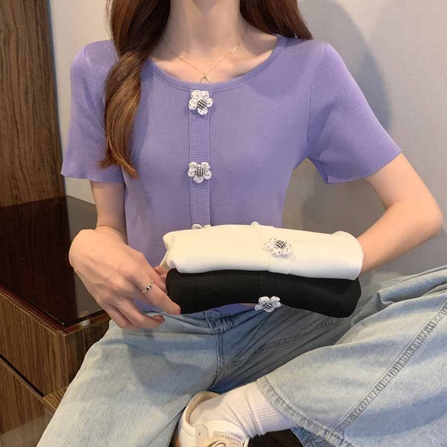 サマーニット ニットトップス ニット ラウンドネック トップス ニット薄手 ショート丈 ハーフスリーブ ツイード スリム 細身
