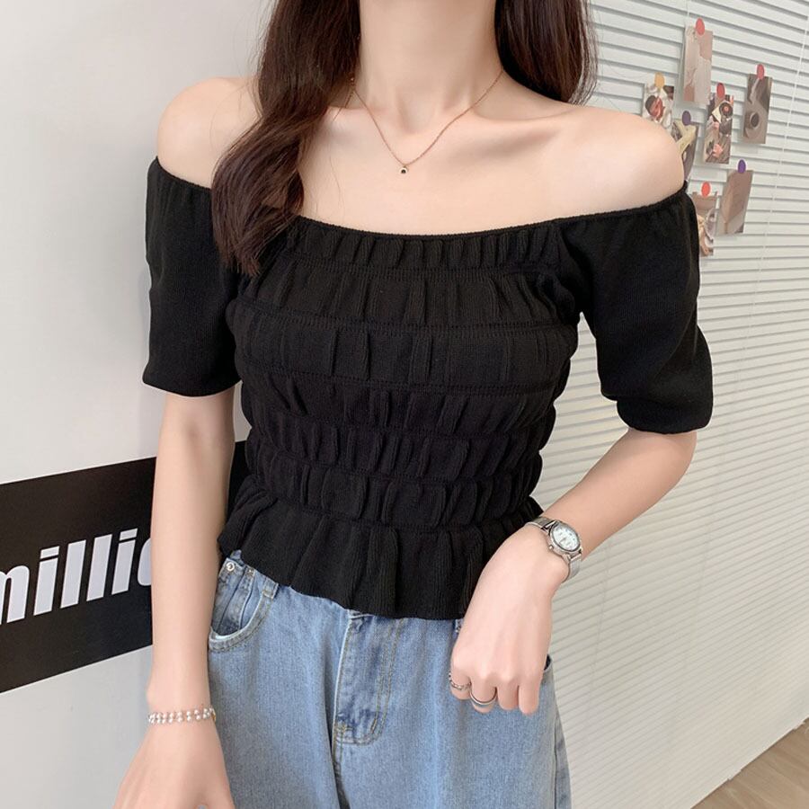 韓国ファッション 夏新作 サマーニットトップス レディース きれいめ ショート丈トップス ニットソー フリル 半袖tシャツ