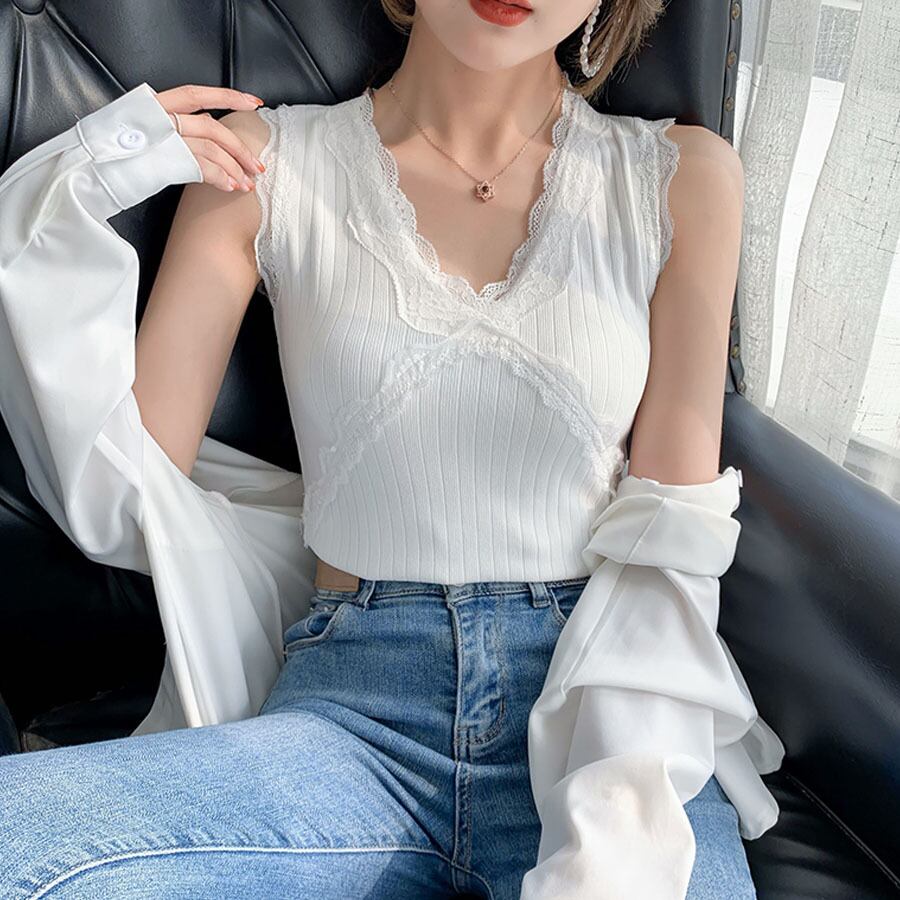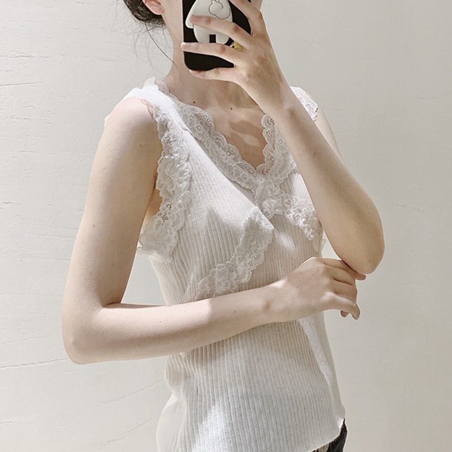 韓国ファッション 夏新作 ニットタンクトップ サマーニット ニットトップス タンクトップ レース付き 花柄レース リブニット