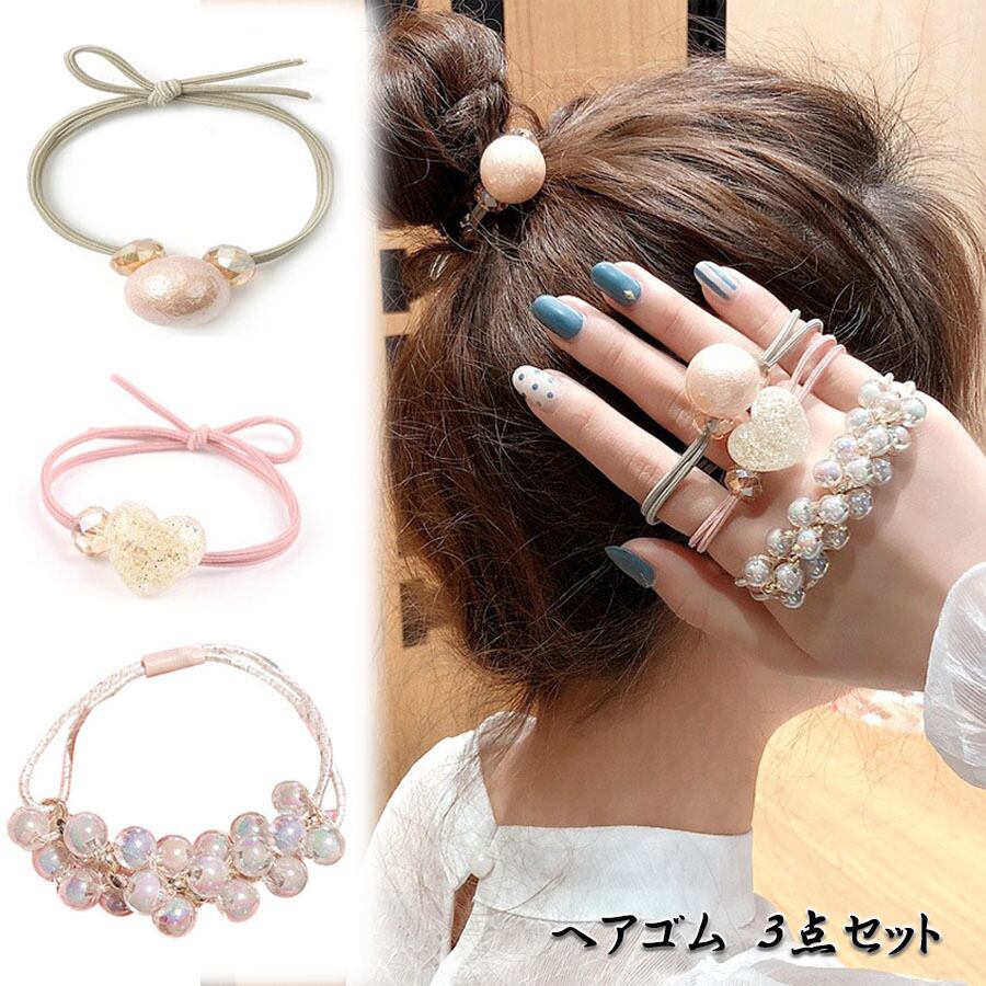 ヘアゴム 3点セット キラキラ 髪留め ブレスレット おしゃれ おとな ヘアアレンジ シンプル 上品 かわいい コロコロ 髪飾り 普段使い
