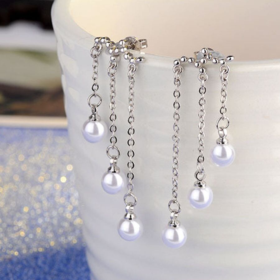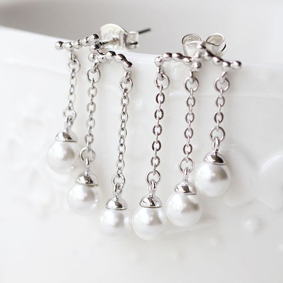 輝く揺れ感の3連上品な小粒のフェイクパールロングピアス。
