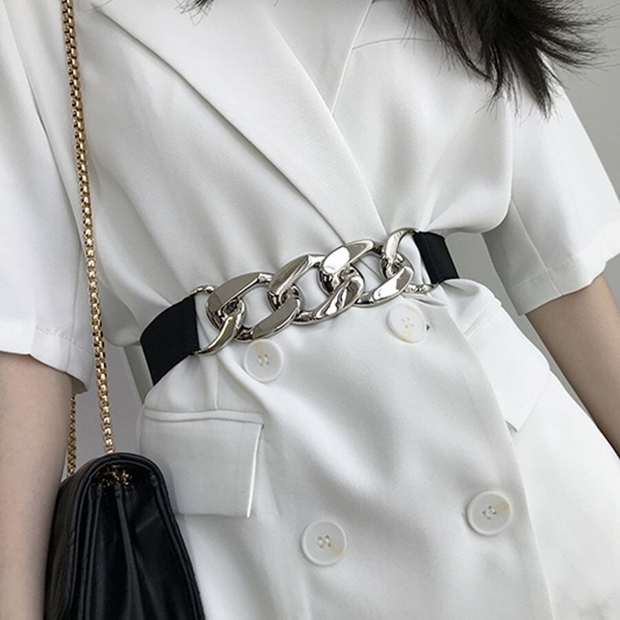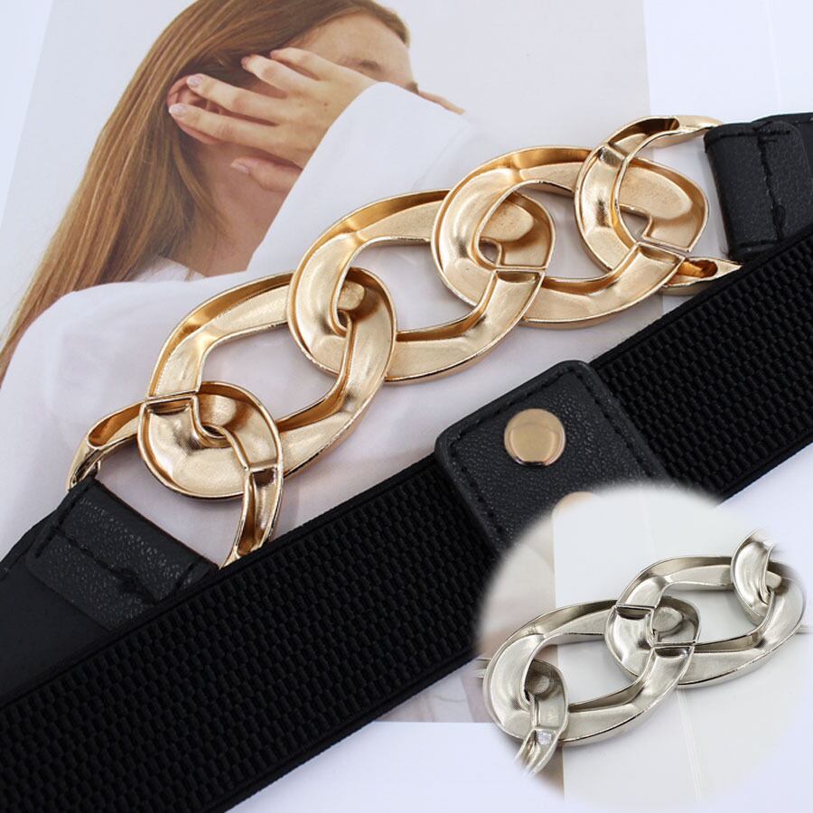 フェイクレザーゴムベルト 細見え おしゃれ サッシュベルト オールシーズン 韓国風 かこいい 太めチェーン 上品 ウエストマーク PU フィット感 ベルト