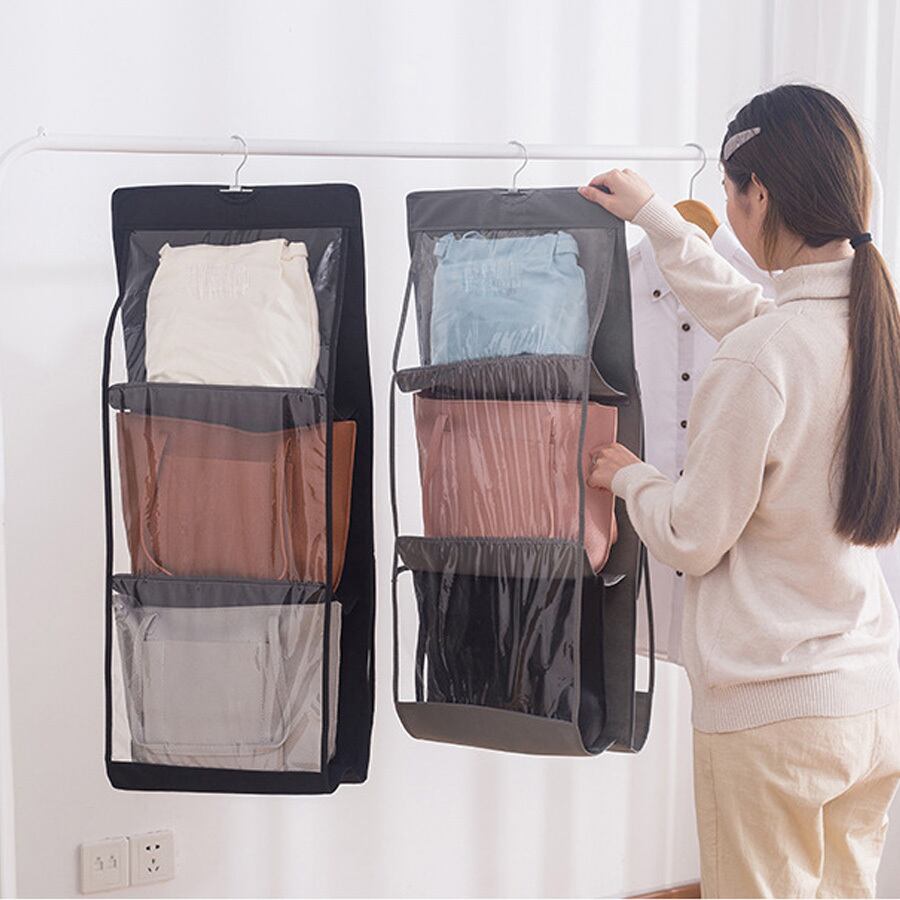 6つポケットのハンガータイプバッグ収納ホルダー。